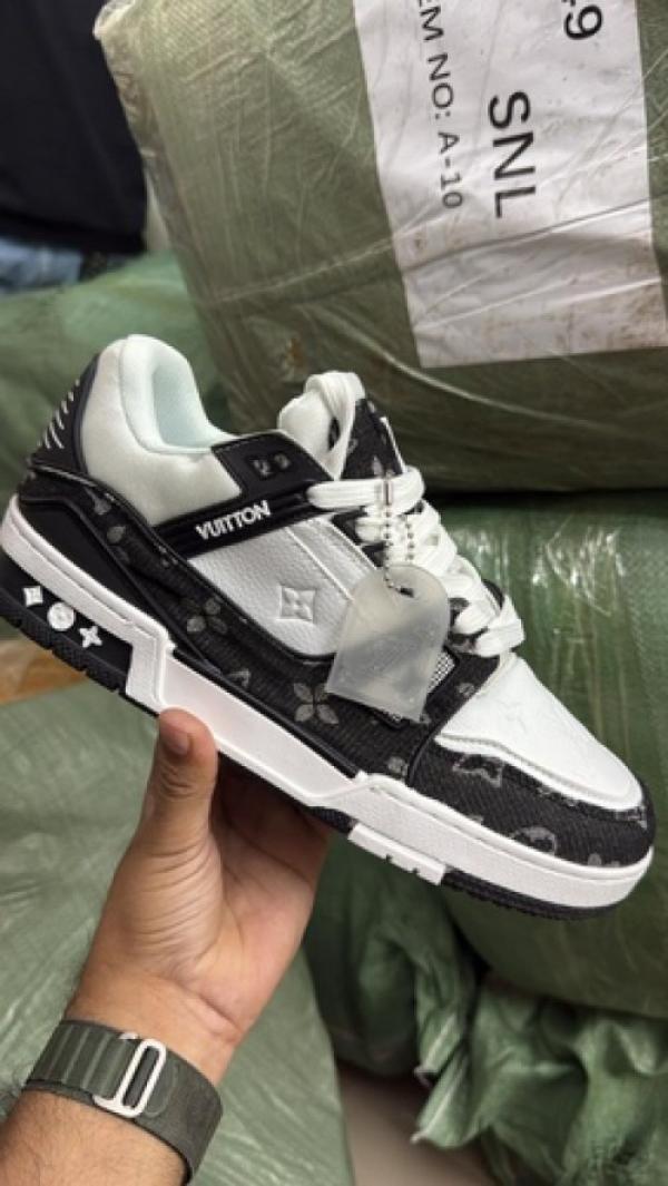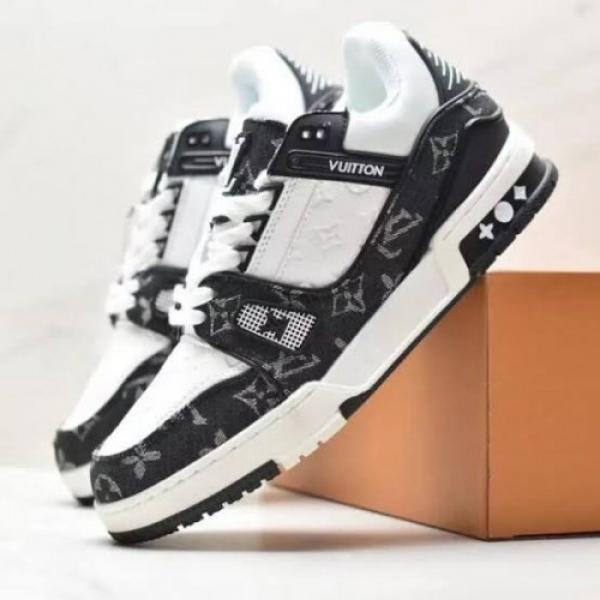 LOUI_S VUITTON LV TRAINER SNEAKERS BLACK AND WHITE MONOGRAM TEXTITE DESIGN FIX